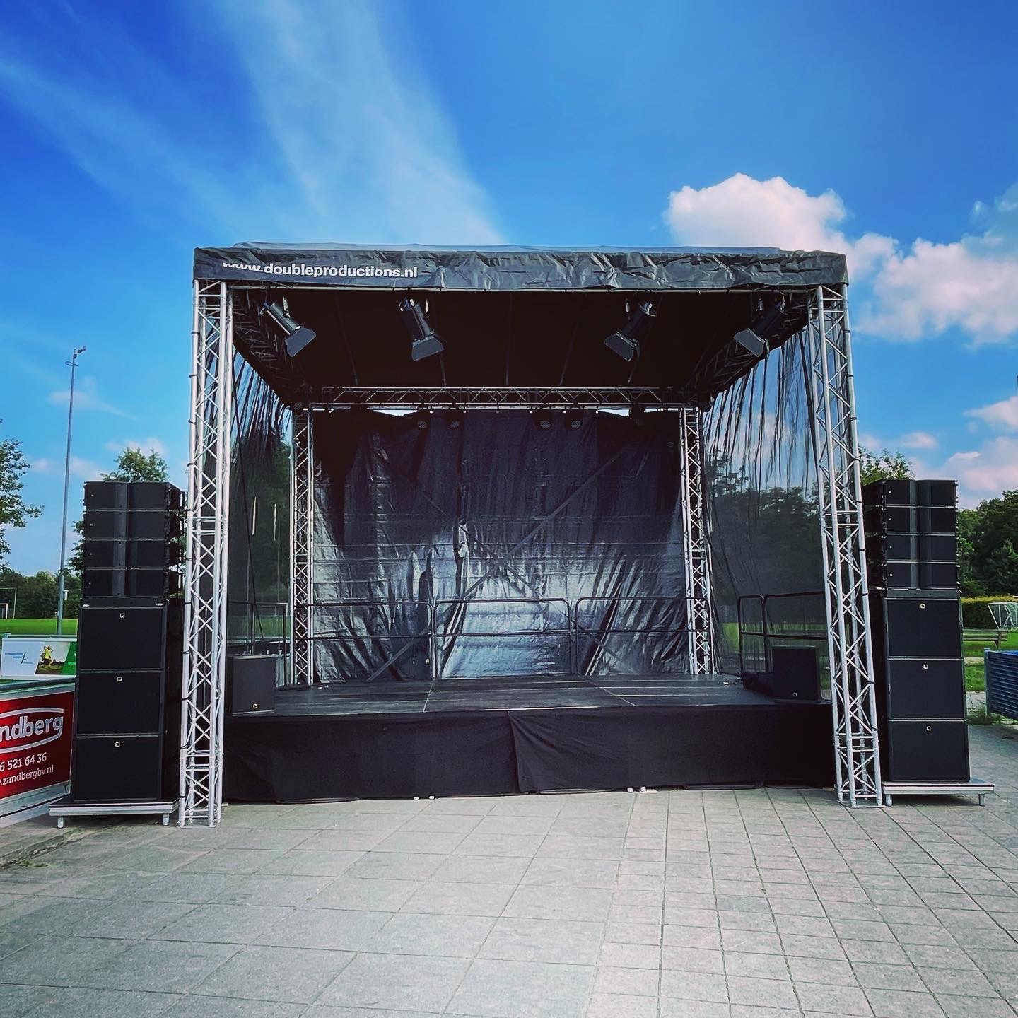 Het podium wordt afgewerkt met een zwarte rok, trap en hekjes aan de achterkant en zijkanten.